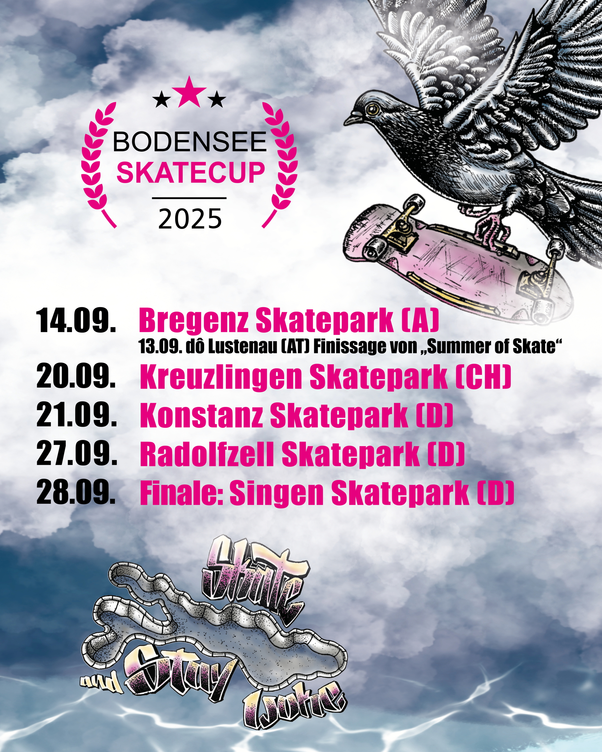 Am 13. September startet der Bodensee Skatecup 2025 – mit fünf Stopps in Singen, Radolfzell, Kreuzlingen, Konstanz und erstmals Bregenz. Skaterinnen und Skater aus Deutschland, Österreich und der Schweiz zeigen ihr Können in einem grenzüberschreitenden Wettbewerb. Der Skatecup findet an insgesamt drei Wochenenden im September statt: 13./14.09., 20./21.09. und 27./28.09.